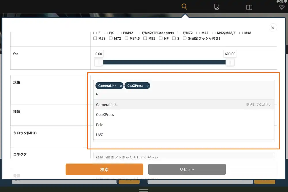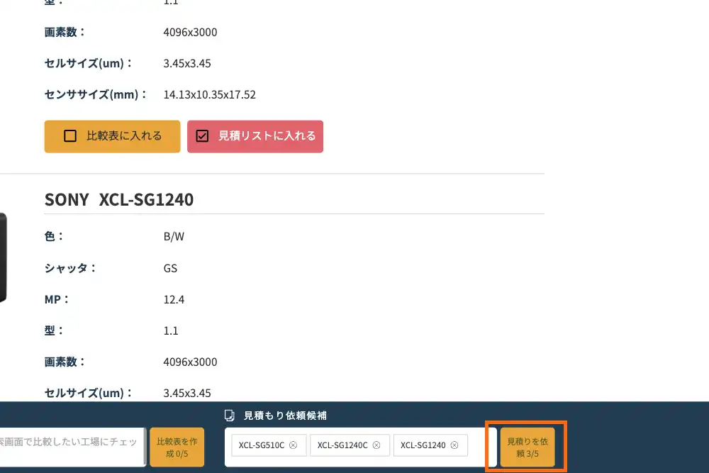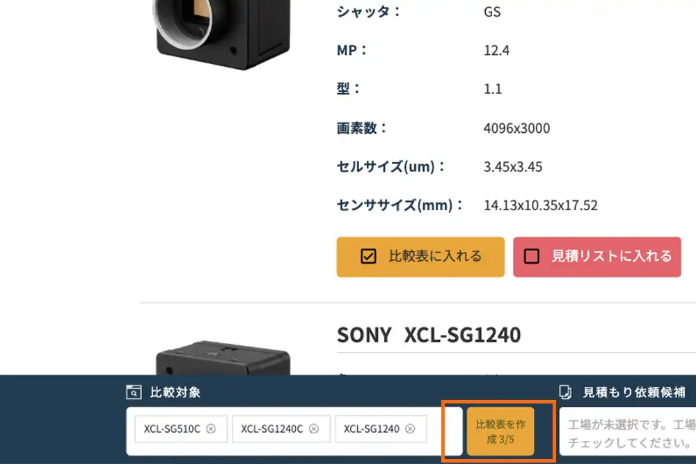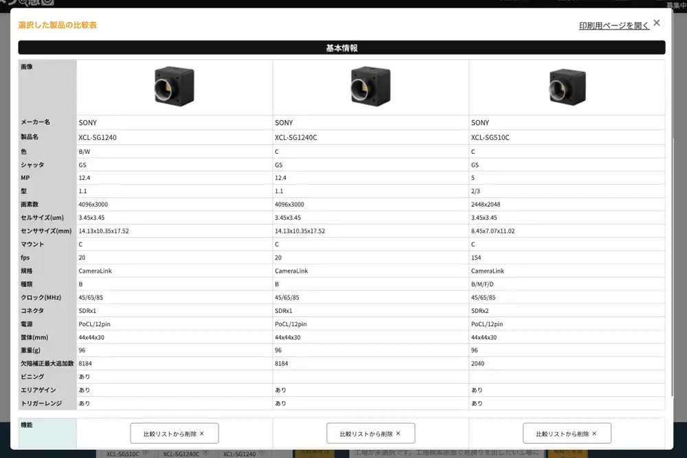 掲載製品は、解像度、カメラタイプ(ライン/エリア)、センササイズ、インターフェースなどの複数の条件で絞り込み検索ができ、要求仕様に合致するカメラを効率よく比較・検討できます。また、気になる製品を複数選択し、まとめて見積もり依頼やお問い合わせができる機能を備えており、選定から導入検討までをスムーズに進めることができます。マシンビジョンカメラ選定の手間を軽減し、最適な一台に出会うための実用的な情報提供を目指しています。